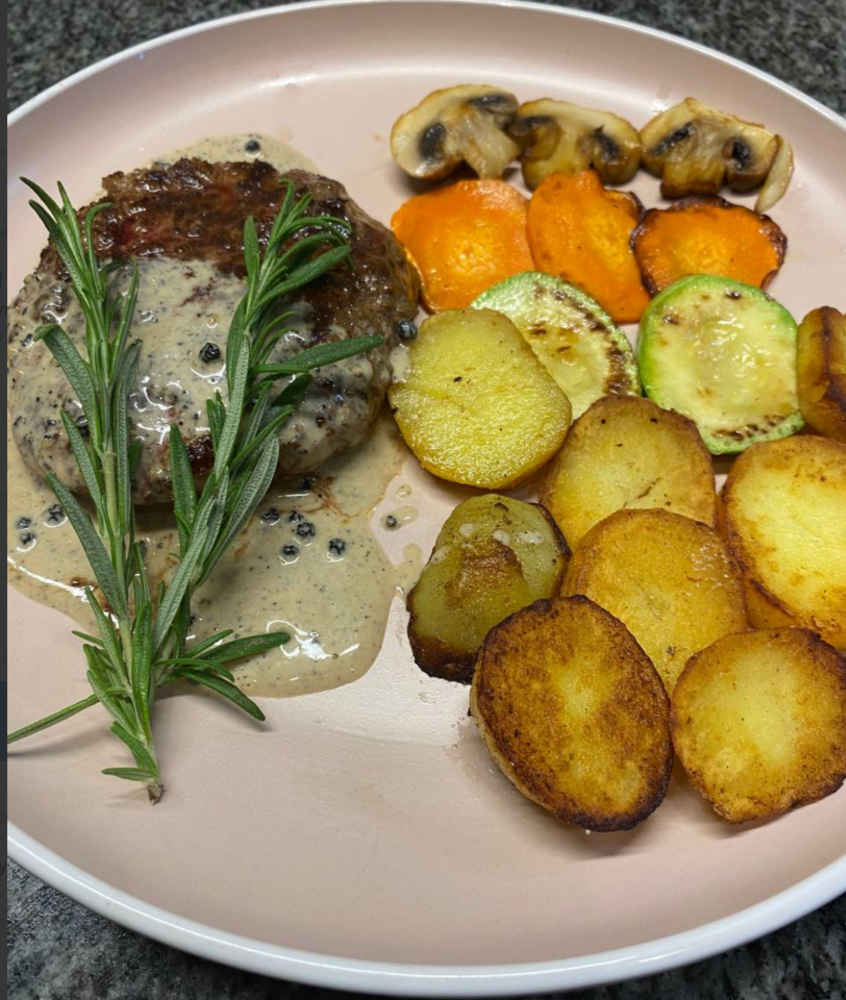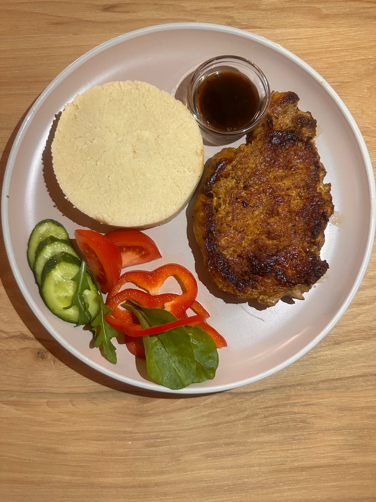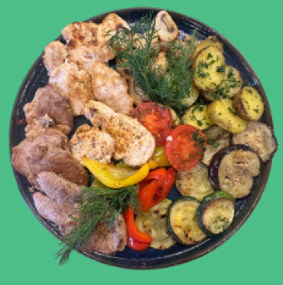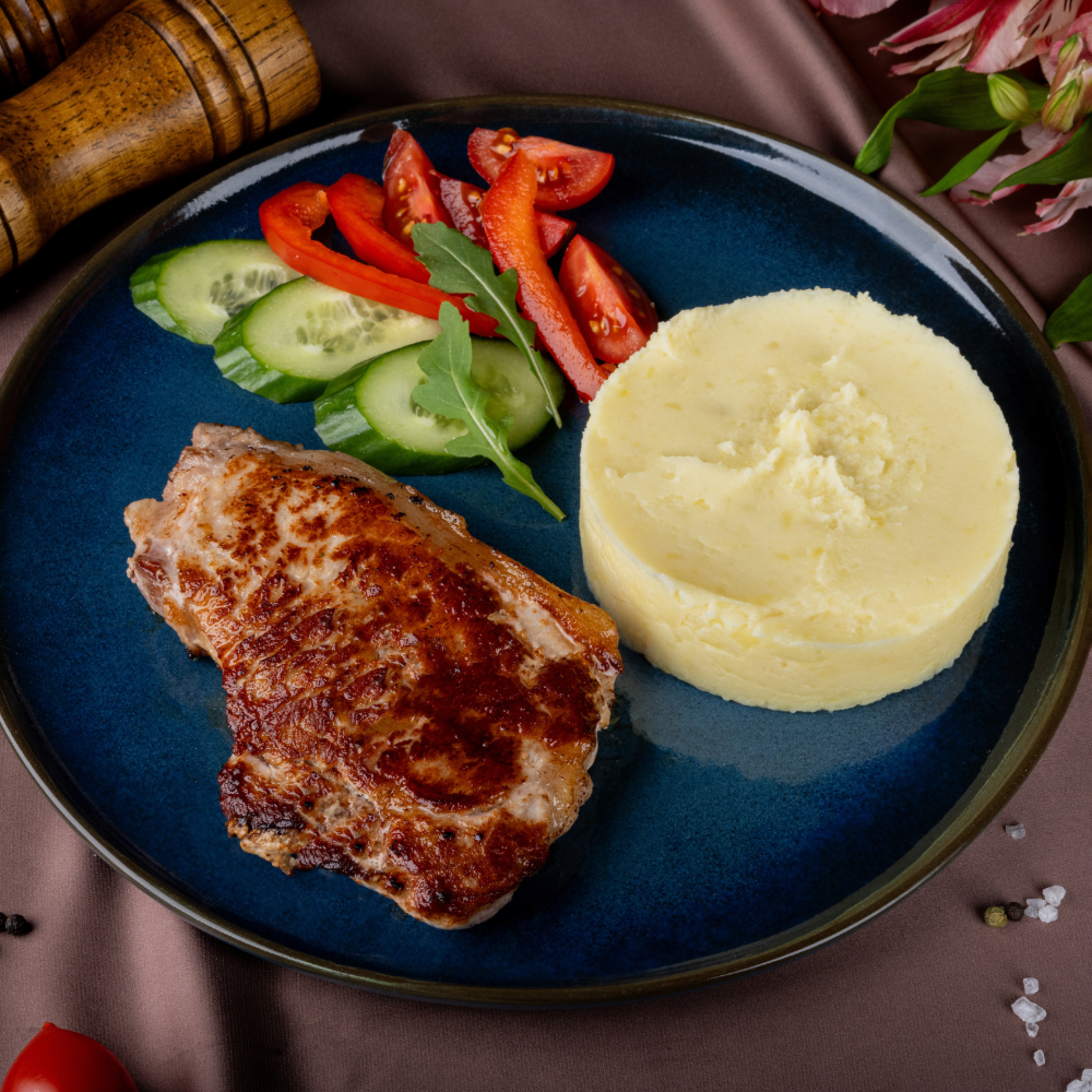 СТЕЙК ЗІ СВИНИНИ З Гарніром СОУСОМ ТА НАРІЗКОЮ_Доставка
