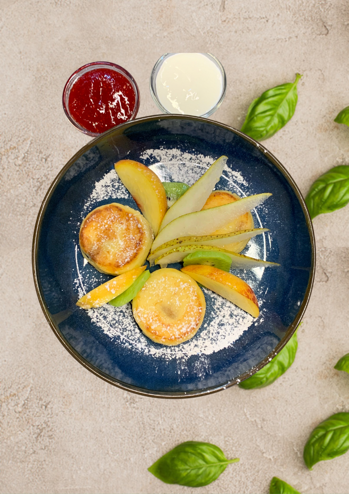 СОЛОДКІ СИРНИЧКИ З ЯГІДНИМ КЮЛІ І СМЕТАНОЮ/SWEET CHEESECAKES WITH BERRY JAM AND SOUR CREAM