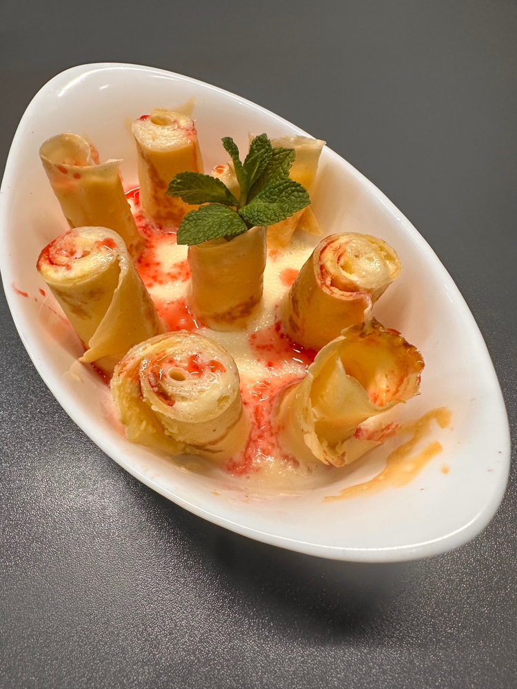 МЛИНЦІ З СИРОМ, ЗАПЕЧЕНІ У ВЕРШКОВОМУ СОУСІ
