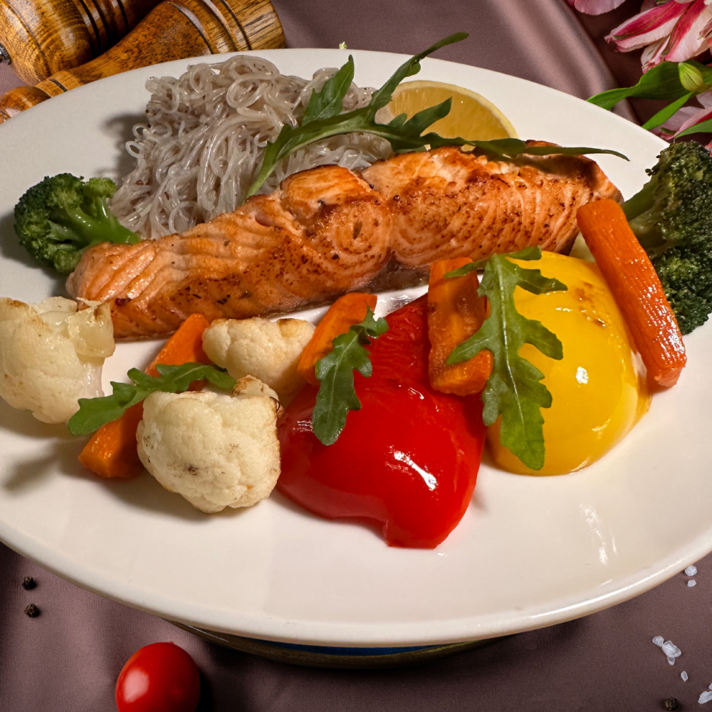 ЛОСОСЬ З ОВОЧАМИ ГРИЛЬ ТА РИСОВОЮ ЛОКШИНОЮ